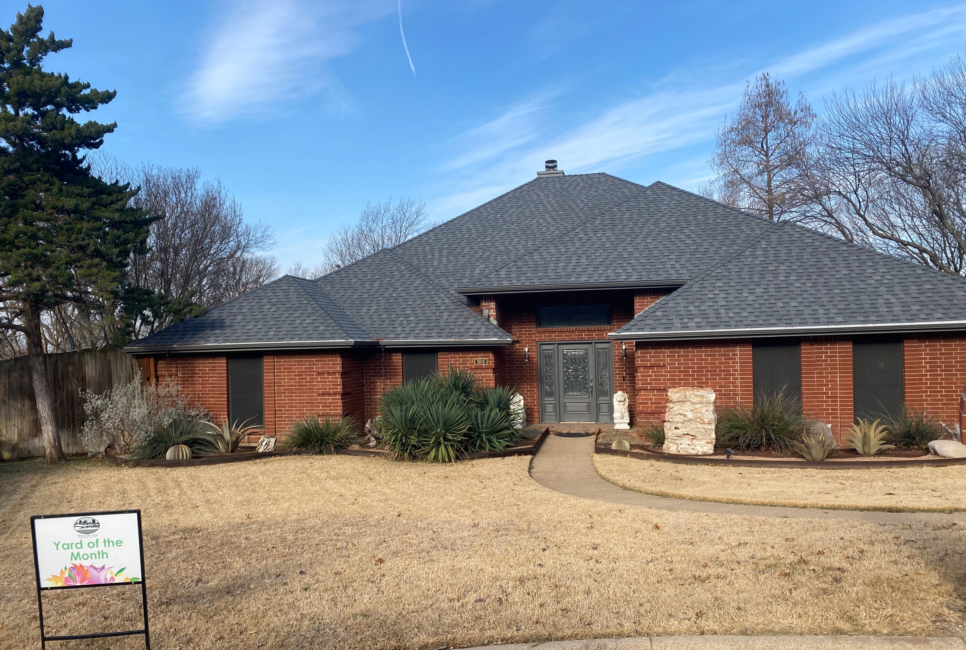 February's yard of the month is at 301 Chandler Lake Ct. The cedar trees that flank the home add a touch of drama. The other landscaping is a combination of Texas hardy and metal sculptures that all blend in to make an attractive addition to the home.
